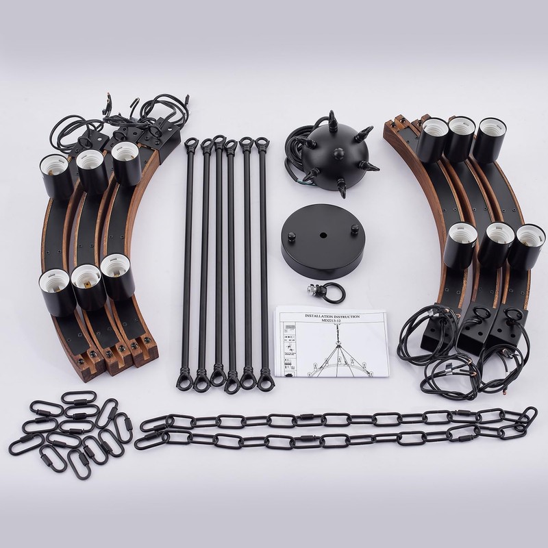 - 12-Light 31.5" Chandelier's Dimensions: Wooden wagon wheel chandelier with 43.34" adjustable black metal hanging chain, the maximum overall length is 63.04," and the minimum overall length is 23.6"; it can be adjustable according to your preference, and design.