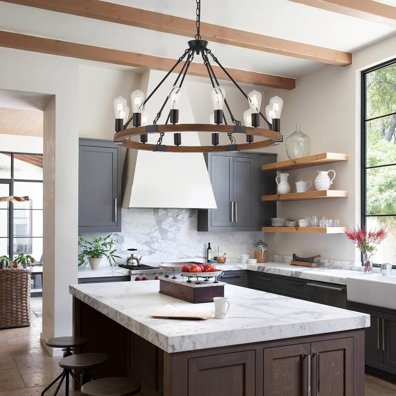 - Wooden Wagon Wheel Chandelier: The farmhouse wood chandelier is full of allure; it comes with a matt black high-quality metal canopy and 12*bulbs base, fully lighting up your house with a retro atmosphere and comfortable feeling.