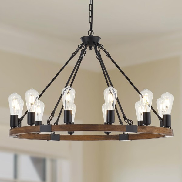 brfaixla 12 Lights 31.5'' Wooden Wagon Wheel Chandelier Farmhouse, Rustic Black Metal Ceiling Pendant Chandelier Vintage Round Wood Chandeliers for Living Dining Room Entryway Foyer High/Low Ceiling