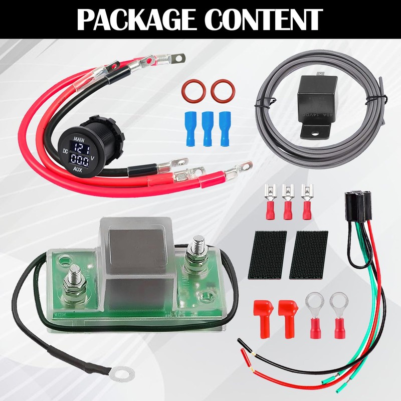 - 【Automatic Intelligent Isolation】The dual battery isolator kit adopts automatic intelligent isolation technology. It can automatically control the connection or disconnection of the two batteries when the vehicle is started and turned off, without manual operation, which greatly facilitates the use.