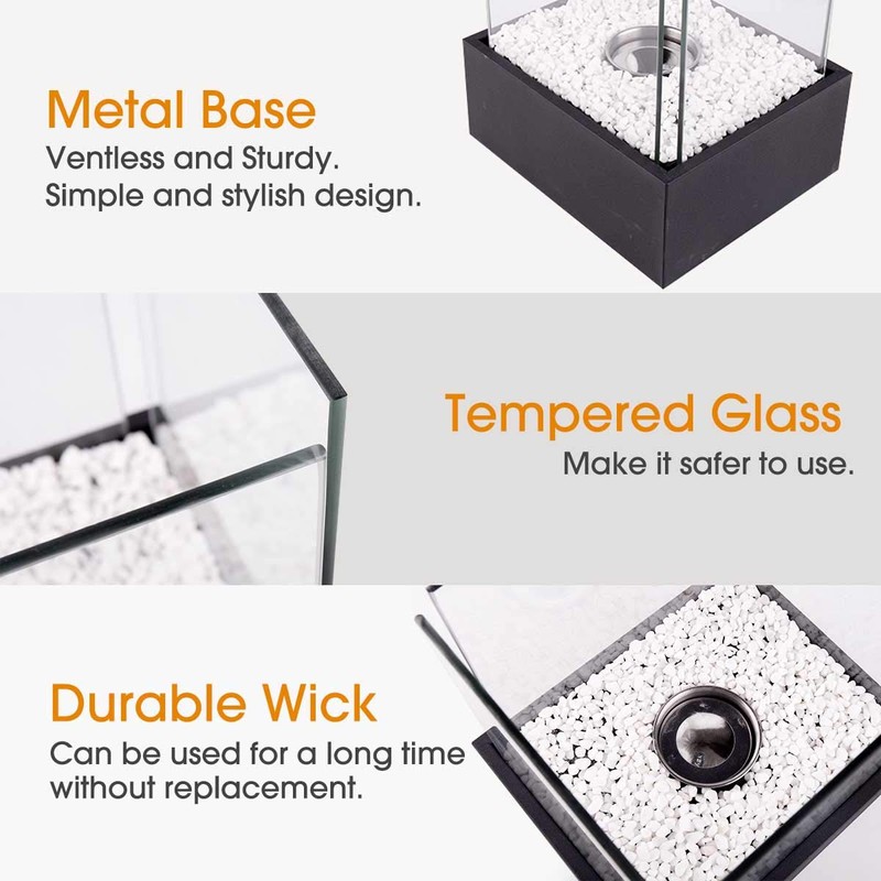 • Windproof & XL Size: Four windshields guarantee your safety in a breezy environment. Burn time is approximately 45-60 minutes when full filled with fuel; Dimensions: 9.6"W x 8.2"D x 11.5"H