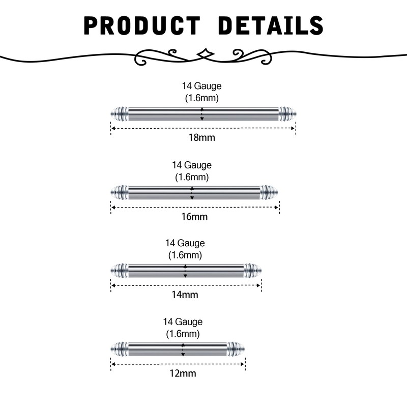 - Bar Thickness: 14 Gauge (1.6mm), Bar length: 12/14/16/18mm, Ball size: 5mm