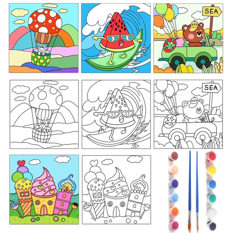 - Portable Canvas Painting Kit: The canvas boards for painting size are 8"x8", moderate size for a backpack, and easy to carry on the go, allowing a person to create paintings anytime, anywhere. Everyone can doodle by following the reference pictures, or use their imagination and creativity to complete these canvas panels.