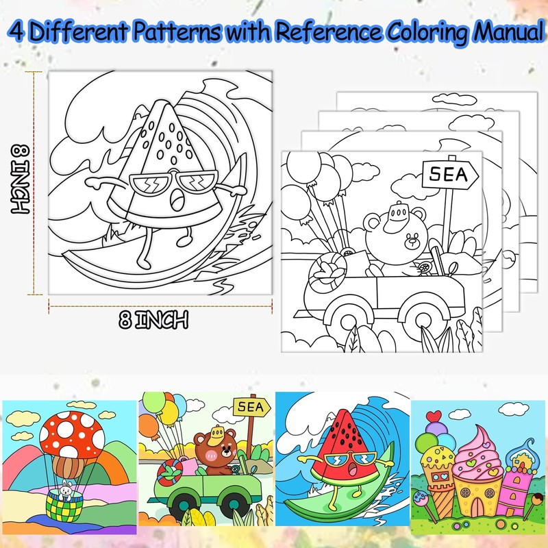 BriCabel 4 Pcs Kids Pre Drawn Canvas to Paint, 8 x 8 Inch Canvas Painting Kits with 12 Acrylic Paint Sets and 2 Brushes, Pre Sketched Canvas Set for Painting for Girls Boys Beginner Artists (Vacation)