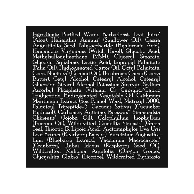 - Key Ingredients: Natural & Certified Organic ingredients, including aloe, protein peptides, MSM, hyaluronic acid, vitamin C, and green tea. 97.5% natural, 70% organic.