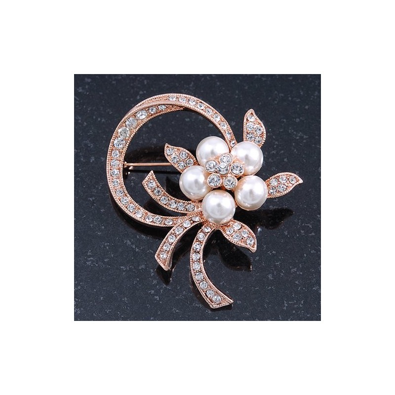 Bridal Crystal, Similutated Pearl Flower Brooch In Rose Tone Gold - 50mm Across