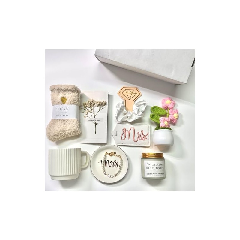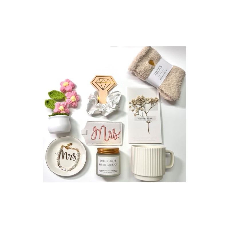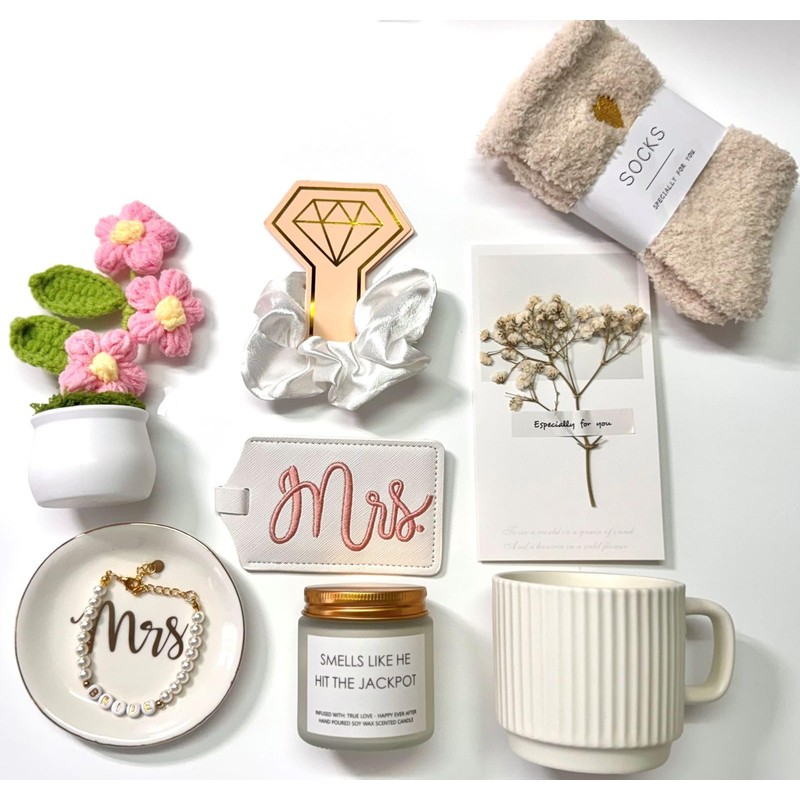 - Bride to Be gifts box: (1)Jewelry Tray and Bracelet (2)Fuzzy Socks (3)Ceramic Mug (4)Knitting Crochet Puff Flowers Potted Plants (5)Luggage Tag (6)Lavender Scented Soy-Wax-Candle (7) Greeting Card (8)Hair Scrunchie