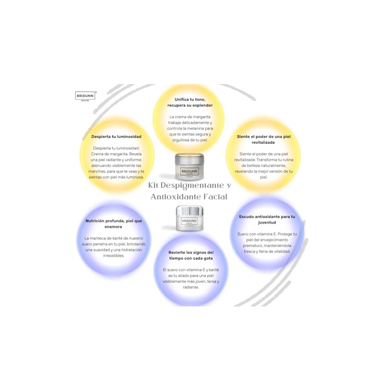 BRIDUNN SKINCARE - BRIDUNN SKINCARE Kit Facial Despigmentante y Antioxidante | Crema Aclarante con Flor de Margarita y Suero con Vitamina E | Piel Radiante y Joven | Natural y No Tóxico. 💎 Fórmula premium para resultados visibles y duraderos. Ingredientes naturales seleccionados y testado dermatológicamente. ⭐ Miles de reseñas positivas. Ideal para quienes buscan lo mejor en calidad y estilo. Producto auténtico con satisfacción total asegurada. ¡No te quedes sin el tuyo y aprovecha esta oportunidad única!