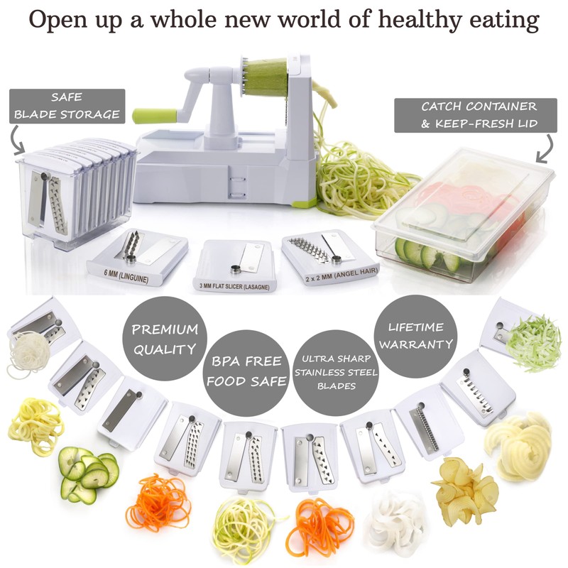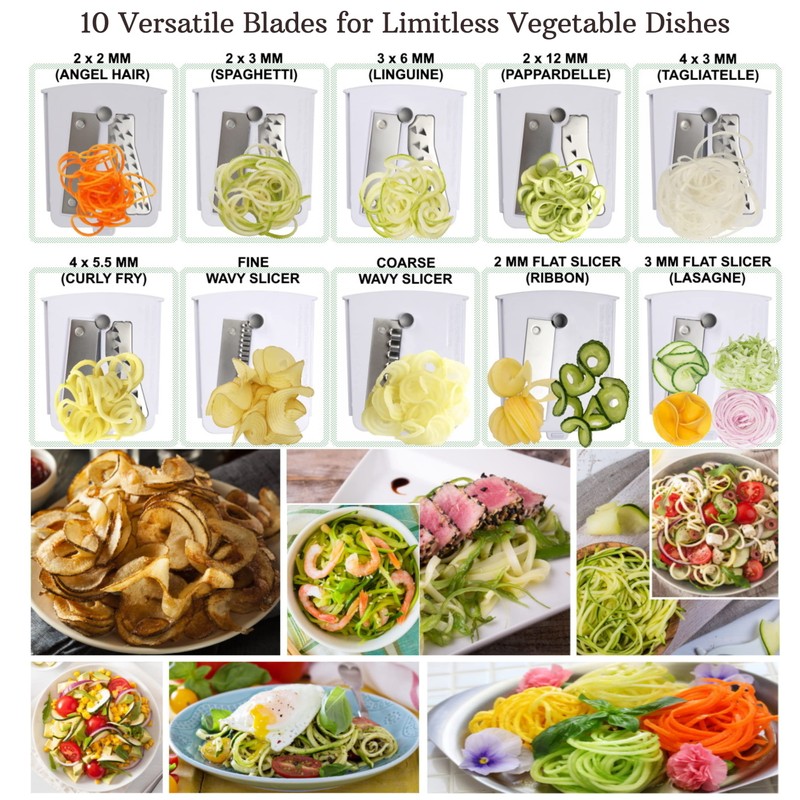 - GET THE MOST FOR YOUR MONEY: ✅ 10 blades to make angel-hair julienne noodle, spaghetti, tagliatelle, linguine, pappardelle, ribbons, curly fries, fine ridged pasta, crinkle chips, lasagne ✅ Catch container & keep-fresh lid: no mess & keep veggie noodles fresh for longer ✅ Supersized, foolproof suction pad with easy ON/OFF lever for steadfast operation ✅ Extra caddy for safe blade storage: no more loose attachments ✅ Innovative design to store this kitchen tool neatly as a single unit.