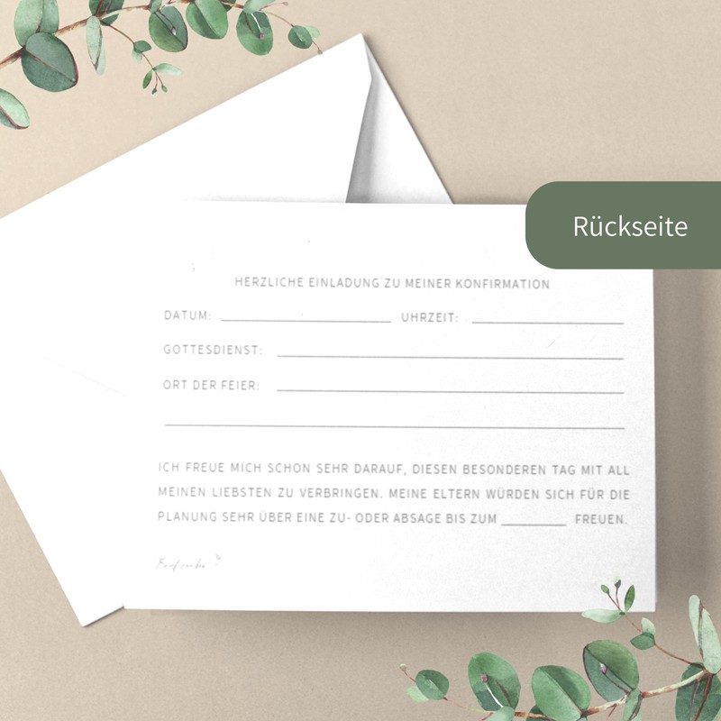 For easy and quick design, the back of the confirmation card is equipped with a practical filling aid. So the most important information such as date, time and place of the celebration can be easily entered. The white, ribbed envelopes made of 100 g paper are perfectly matched to the cards and underline the stylish look of your confirmation party card.