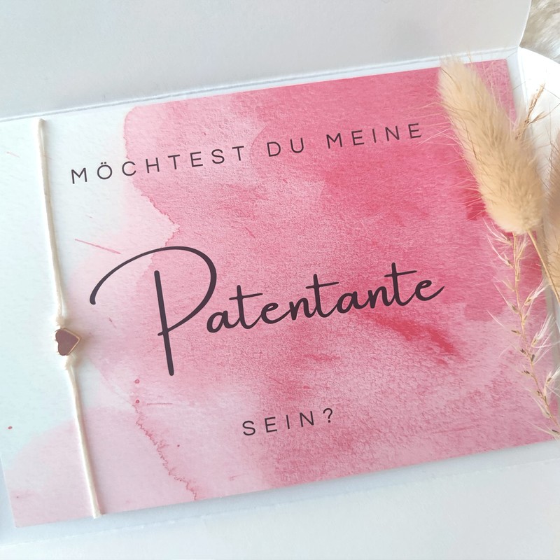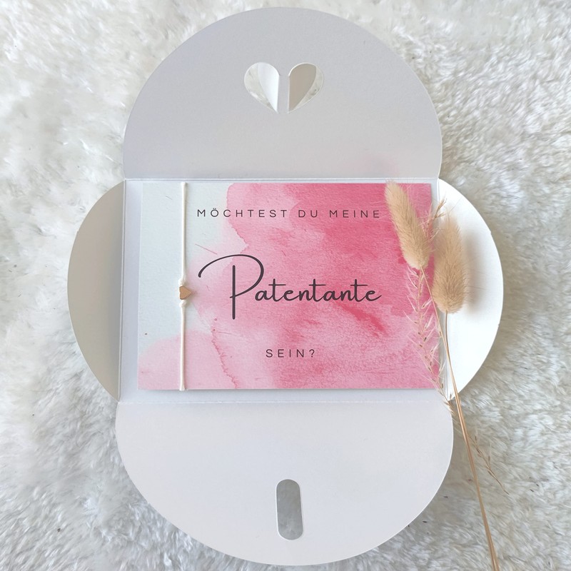 The card with pink watercolour look is in an envelope with heart closure. When opened, your girlfriend will see the words "Will you be my godmother?". On the back there is also space for further personal words.