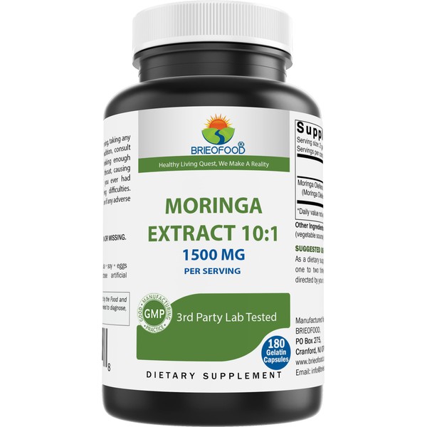 Brieofood Moringa Oleifera Extract 10:1 1500 mg - 180 Capsules - Non-GMO and Gluten Free Supplement - Moringa Leaf Green Superfood