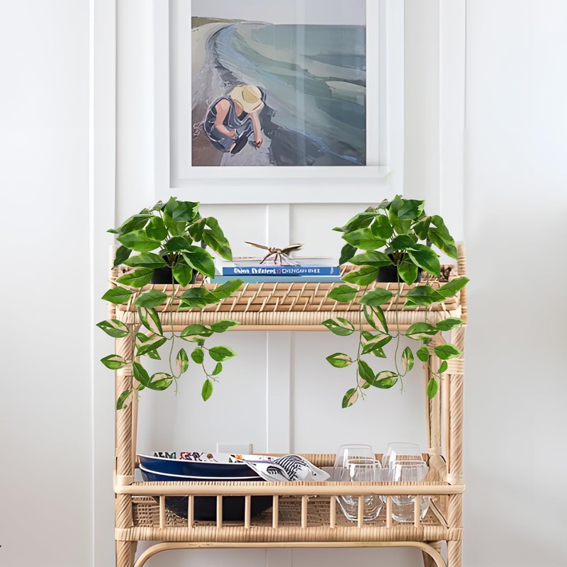 Kitchen Counter or Open Shelf Accent--Brighten your cooking space with greenery that won’t interfere with your workflow. These faux trailing plants are perfect for corner shelves, floating racks, or windowsills.