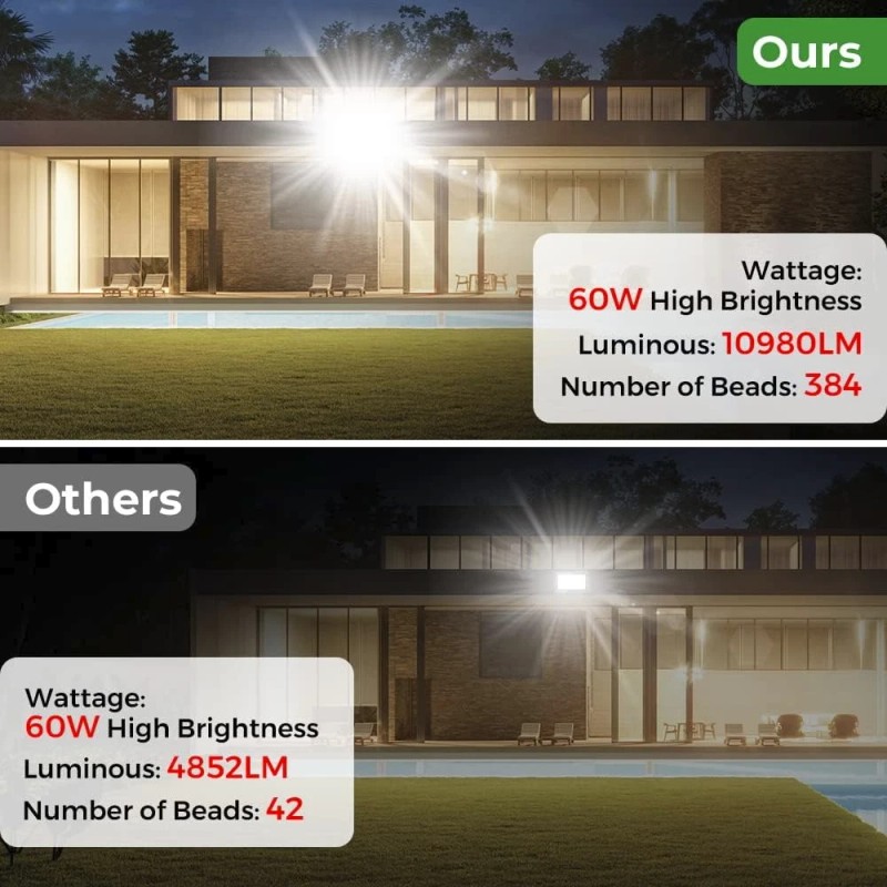 ☑【Powerful & High-Quality】The floodlight adopts 2835SMD chips with 384leds, 6000 Kelvin, 60 Watts,10980 Lumen.High brightness, no flicker, low heat generation, low power consumption, energy saving and environmental protection, which saves 80% energy than ordinary bulbs.Advanced anti-vertigo design can better protect the eyes from injury.120 degrees beam angle, providing efficient lighting.80+ high color rendering makes the colors appear richer. It is a good choice for indoor or outdoor lighting.