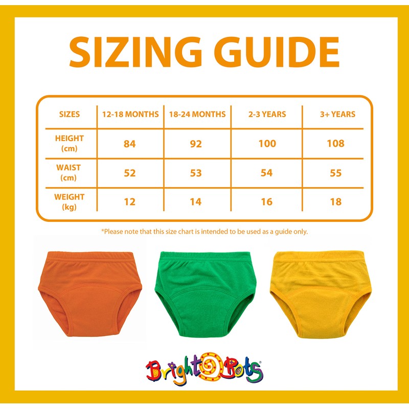 These potty training pants are designed to aid and assist you and your little one with their toilet training. They have been updated in design and sizing for the best performance ever. They look and feel just like the pants that bigger boys and girls wear and so help your child progress through training. They are made from comfortable cotton terry with softly elasticated legs and have an added absorbent layer of 100% cotton terry towel and a PUL waterproof lining in the gusset area. This terry layer gives a small amount of absorbency for accidents and the pul waterproof layer gives a little extra time to change after an accident. The training pants are washable at 40c and hard wearing and so are inexpensive and environmentally friendly alternative to disposable training pants Please note: The Bright Bots training pants will be of assistance in toilet training but are not designed for multiple accidents. Sizes are approximate only as every child is different. Small approx. 12m or up to slim 18m, Medium approx. 18m or up to slim 24m, Large 2y to slim 3y, EX Large 3y to slim 4y. Sizing as based on clothing size i.e. if your child is wearing 18-24m clothing size Medium is likely the bst fit - also see the sizing chart. Care instructions: Machine washable at 40c. Tumble Dry on Low heat setting.