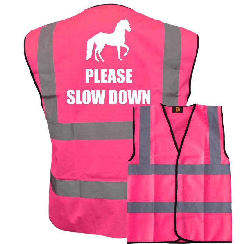 Bright Pink High Visibility Vest with White Text PLEASE SLOW DOWN WITH IMAGE- HORSE RIDING By Brook Hi Vis Small