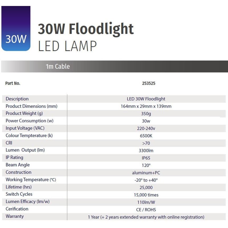 - High-Intensity Lighting Output: This 30W LED floodlight delivers a remarkable 3300 lumens of bright, clear light, making it ideal for outdoor areas that require excellent visibility. The cool daylight colour temperature of 6500K ensures crisp, white illumination, perfect for enhancing the safety and appearance of gardens, driveways, and pathways.