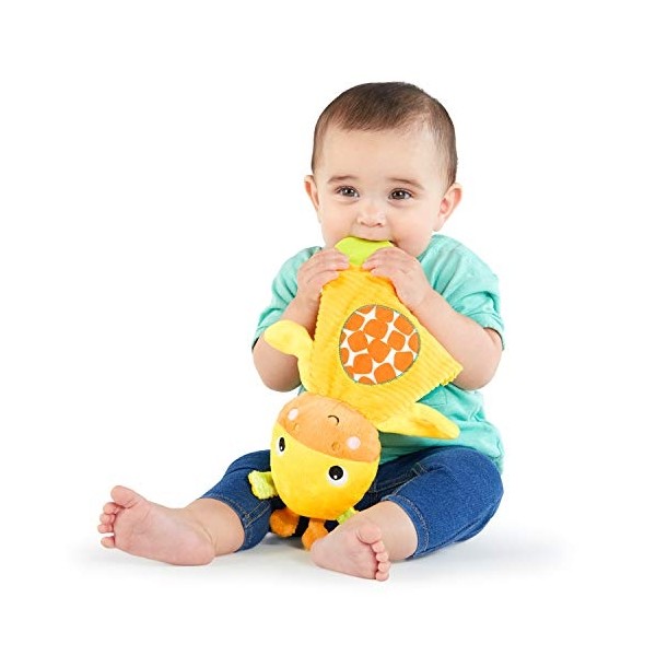 Add creature comforts to baby’s uncomfortable teething time. The Snuggle & Teethe safari-themed plush toy from Bright Starts is made to soothe teething babies wherever they go. Baby will love the snuggly-soft fabric and captivating crinkles of this newborn toy. Not only is this toy fun to cuddle, but their feet double as teethers to help soothe aching gums. With this bright yellow giraffe buddy, things are only looking up, up, up!