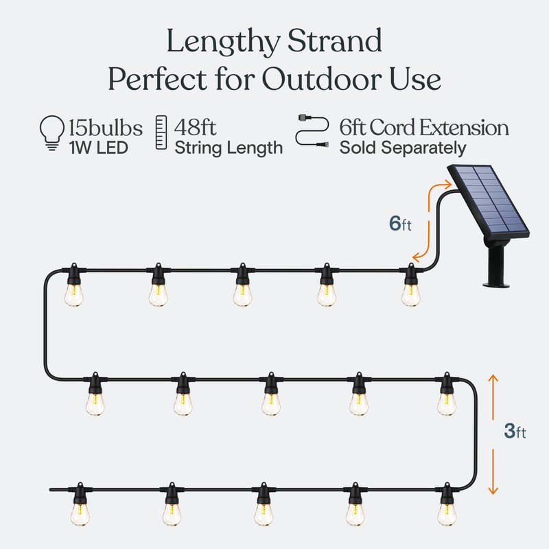 - Durable LED Solar Powered Outdoor String Lights: 48 ft long Christmas string lights with 15 LED lights and detachable solar panel with on/off switch located on the back. 3' between bulbs and between the solar panel and first bulb. The lit portion is 42 feet. LED bulbs last 20,000 hours and solar panel is rated at 1,000 charge lifespan (can last approximately 2.5 years). Direct sunlight is best for a full charge, though you can get some use from charging in indirect light.