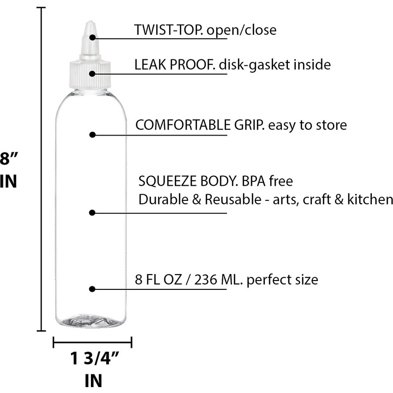 - Twist open and close squeeze style top is the perfect option to ensure your products don't leak or spill