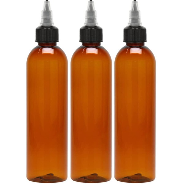BRIGHTFROM Twist Top Applicator Bottles 8 OZ, Squeeze Empty Plastic Bottles, Black Nozzle, BPA-Free, PET, Refillable, Open/Close Nozzle - Multi Purpose (Amber) Pack of 3