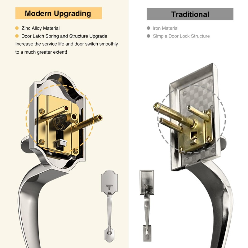 - Modern Upgraded Front Door Lock Set: Our modern main door lock set is crafted with heavy duty zinc alloy, featuring an enhanced door latch spring and structure. This upgraded design sets it apart from traditional styles, significantly improving its service life and ensuring a smoother door switching experience.