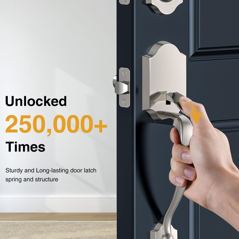 - Solid Door Handles brushed nickel: These front door handle sets have been tested and can be unlocked more than 250,000 times, ensuring durability and longevity. With our front door lock set, you can provide enhanced protection for your family and loved ones.