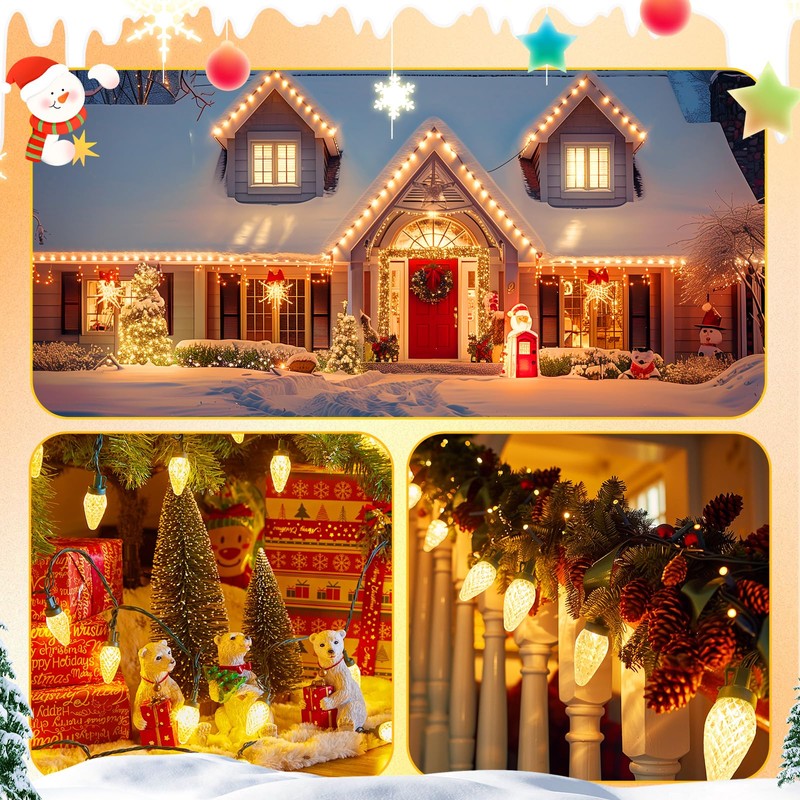 - 【 End-to-End Connectable 】- Our C9 LED Christmas lights allow you to connect up to 3 strands end-to-end, providing a total coverage of over 200 feet. Whether decorating your Christmas tree, outdoor roofline, or house exterior, these lights offer flexible options for creating a grand lighting display. Easy to install for any outdoor Christmas decoration