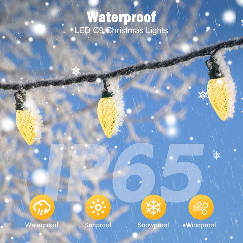 - 【 Waterproof & Shatterproof 】- Designed for outdoor Christmas decorations, these C9 Christmas lights are IP65 waterproof and shatterproof, able to withstand harsh weather conditions such as rain and snow. Ideal for decorating rooftops, windows, gardens, and more. (Note: Adapter is not waterproof, please keep it dry.) Keep your home festive throughout the holiday season