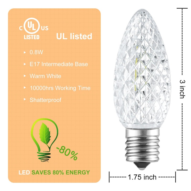 • What Color: Warm white c9 led bulbs, fits into c9 or e17 light sockets. Pack of 25 pieces bulbs