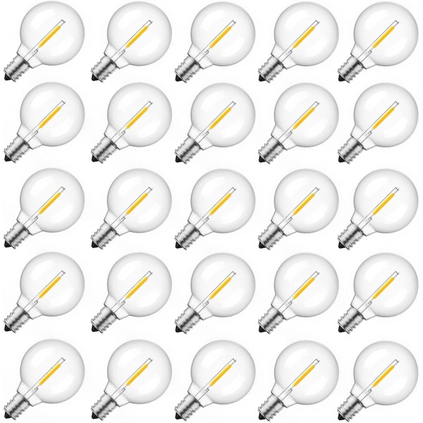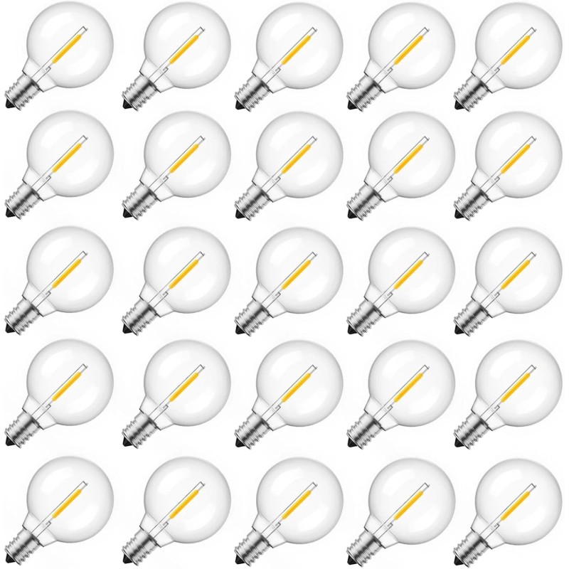 - Shatterproof LED Light Bulb: 1.5 inch globe shatterproof warm light bulbs made of plastic, much shatterproof than traditional glass bulb. 25 counts outdoor light bulbs per pack. Each string light bulbs has been inserted into it's own compartment to prevent cracking