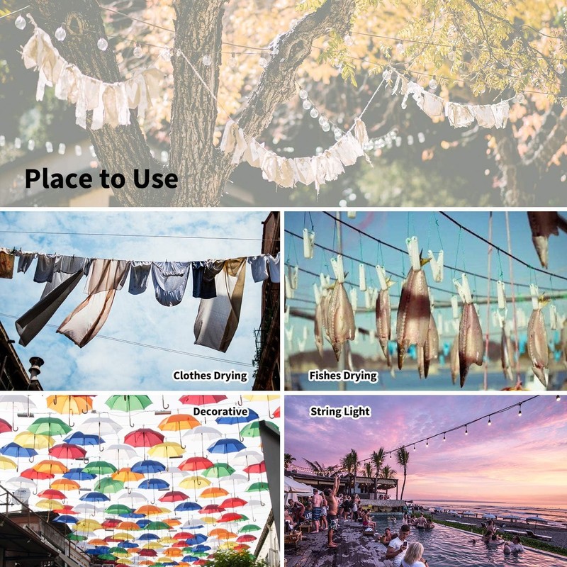 - 【Multi-function】It can be used for hanging heavy globe string lights, curtain lanterns, keep safety of hanging lights in the air. It can also be used for hanging dry clothes, facilities for sunbathe at day etc. 304 wire rope cable can be easily trimmed to any desired length you want.
