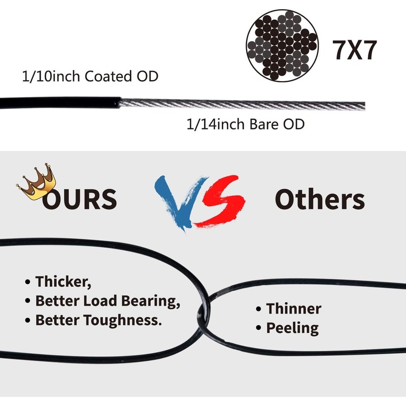 - 【Safe and durable】200fts PVC stainless steel cable is insulated and waterproof, cable bare outer diameter is 1/16", coated outer diameter is 3/32". Breaking Strength is 480lbs.