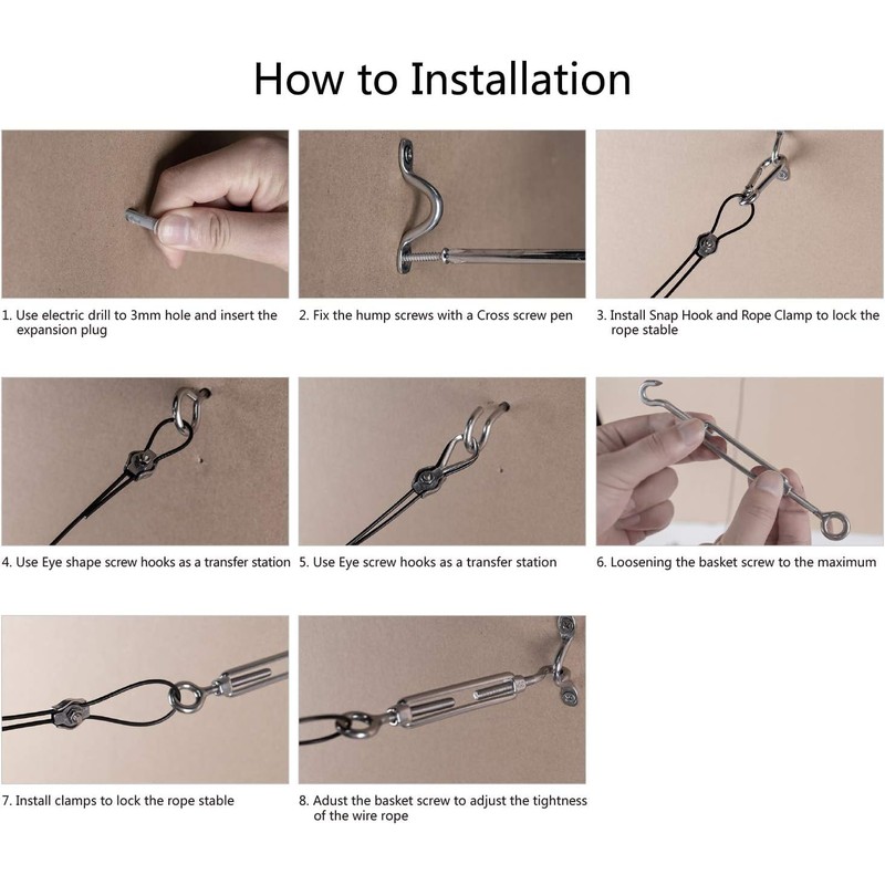 - 【A complete set of suspension equipment】The product includes all the tools needed in the hanging process, so that you can easily and quickly install the stainless steel hanging rope, and quickly hang the items you want.