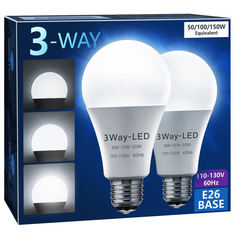 - 3 WAY LIGHT BULBS 50 100 150W: 5000K daylight white 3 way light bulb uses 9/15/20W to yield equivalent illumination of 50/100/150W incandescent and halogen bulbs. 3 lighting levels: high-medium-low (800lm-1400lm-2000lm).