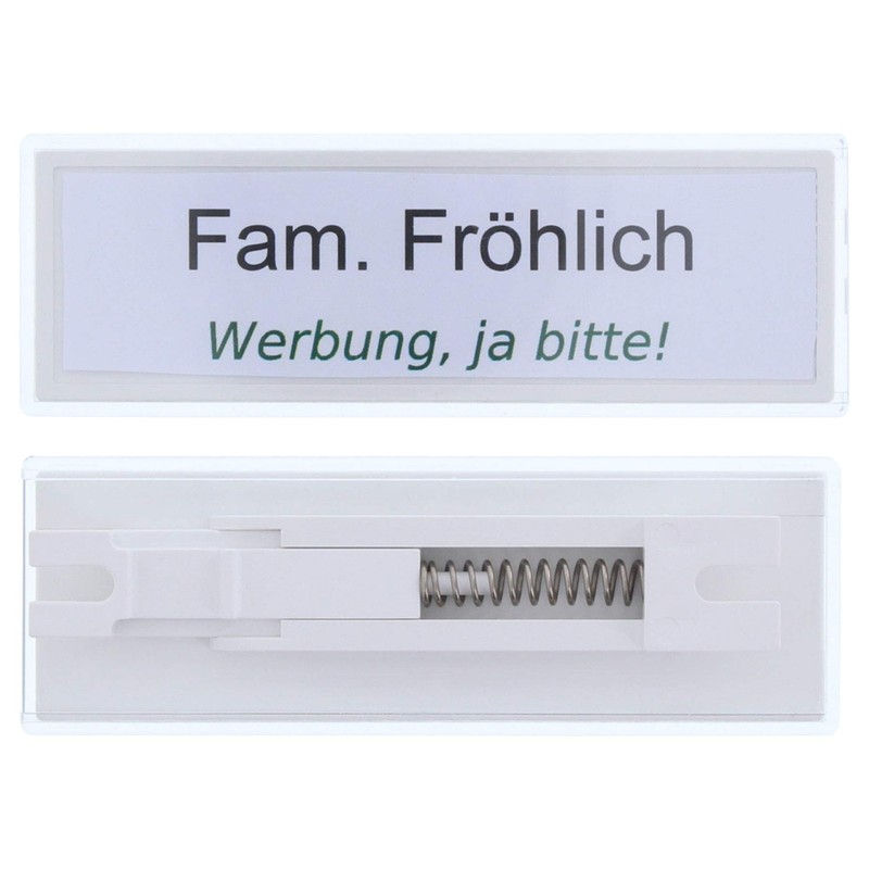 BRILD has developed a name plate that adapts to the size of the name window on your letterbox and thus ensures a beautiful and tidy look. The variable mounting mechanism is simply inserted into the name window of your letterbox.