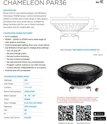 Bring color to your lighting design with Brilliance Chameleon PAR36 lamps! Control dimming from 2200K to 5700K and a wide range of reds, greens, and blues from your smart device. Suitable for damp locations and for use in totally enclosed luminaires.