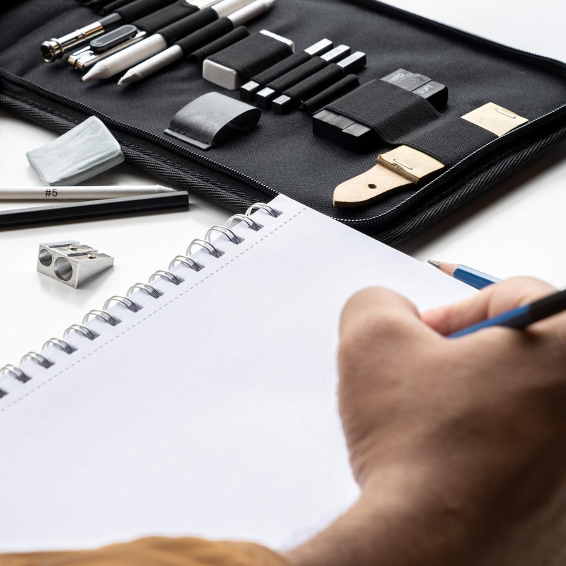 • Essential Tools - This set includes 12 sketch pencils, 1 woodless graphite pencil, 3 charcoal pencils, 3 graphite sticks, 3 charcoal sticks, 1 kneaded eraser, 1 white vinyl eraser, 2 sharpeners, 1 art knife, 3 blending stumps, 1 piece of sandpaper, and 1 pencil extender.