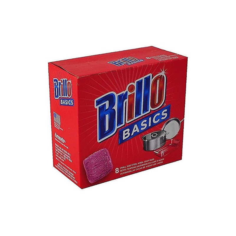 Brillo Basics Soap Pads 8 Pack. Brillo Basics Soap Pads. Eliminate Hard To Clean Messes. Original Grease Fighting Soap Cuts Through Tough Messes. Anti-Rust Formula Resists Rust. Bonded Edges Maintains Shape of Pad. Bright spots beyond the sink. Brillo helps cut through grime and leaves tough to clean surfaces brilliant whenever you clean. 8 Small size steel wool soap pads in package. DDD-54843