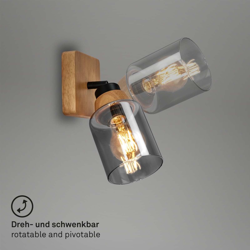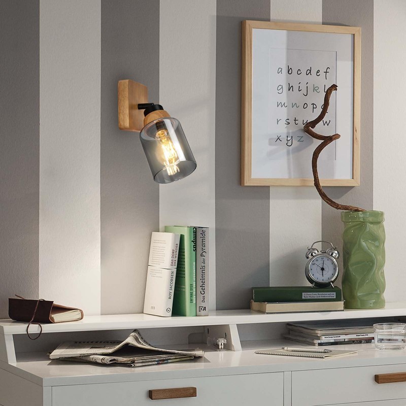 - Targeted lighting: high-quality wall lamp in black with a lamp head made of high-quality smoked glass and a beautiful wood appliqué