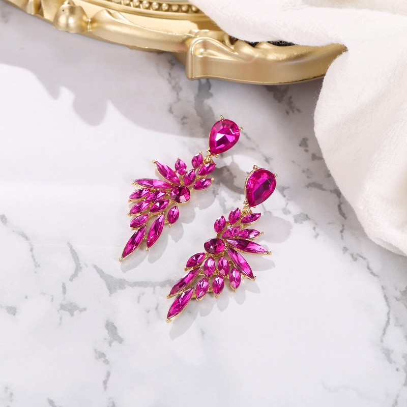 BriLove Bridal Wedding Earrings for Brides Bridesmaid, Crystal Teardrop Marquise Cluster Bling Rhinestone Dangle for Women Fuchsia Gold-Toned