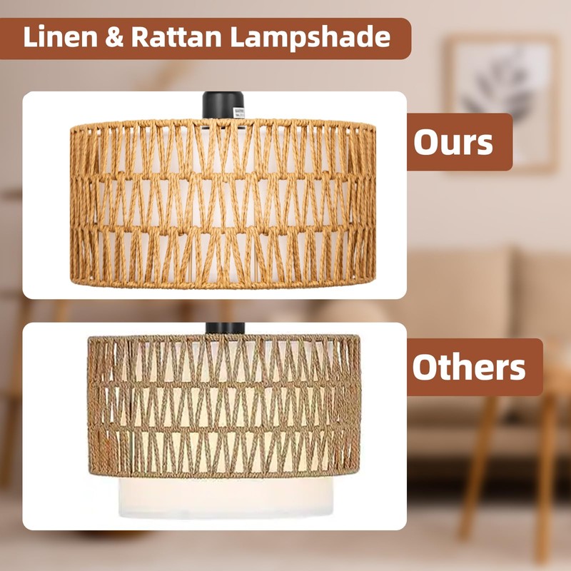 - 1 Light with 2 Style Lampshade: Our standing boho lamp features a 360-degree horizontal rotation and swiveling lamp head, allowing you to customize the lighting angle. The rattan lampshade emits a charming grid light effect, while the linen+rattan lampshade prevents light leakage, creating a warm and romantic atmosphere