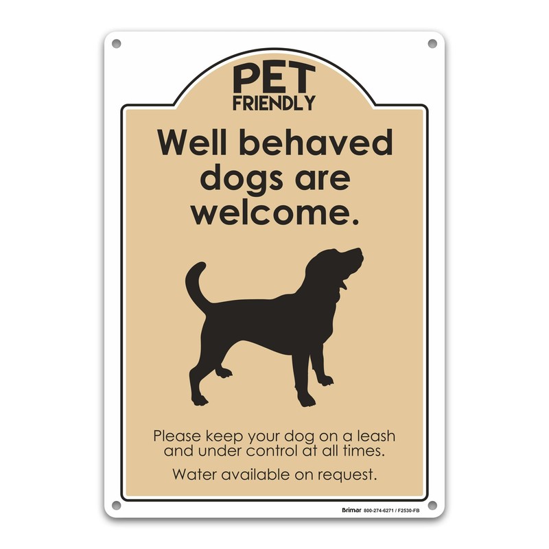 • CLEAR MESSAGE: Reads "Pet Friendly Well Behaved Dogs Are Welcome. Please Keep Your Dog On A Leash And Under Control At All Times. Water Available on Request." to inform visitors of your policies.