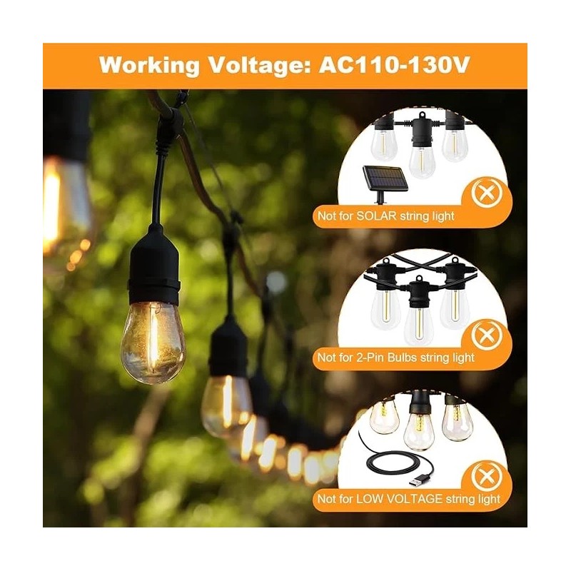 - ⚠️Voltage: Works with 110V-130V only (⚠️ Not for low-voltage solar string lights like 3V/6V).