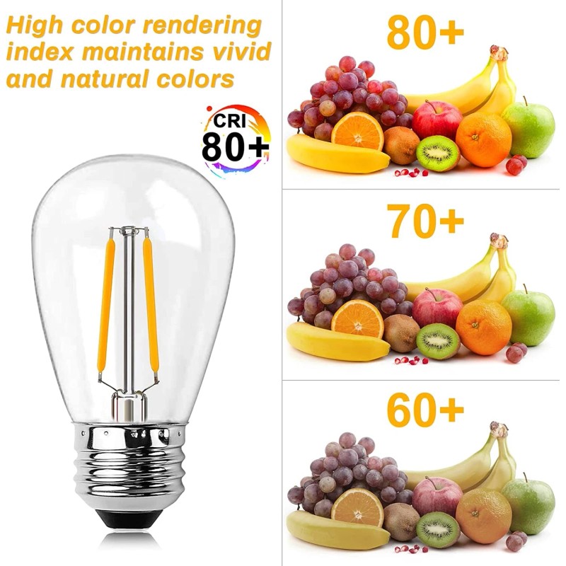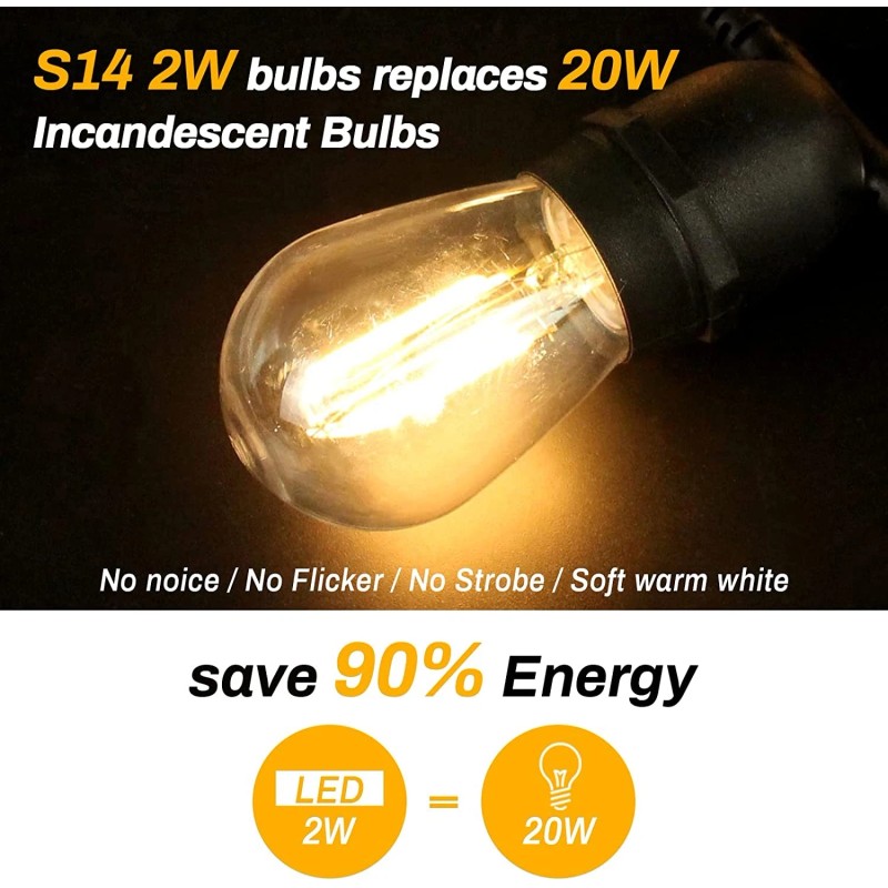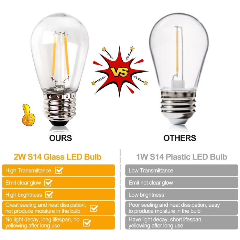 - 💡【Outdoor Replacement Bulbs】This 2W S14 LED filament Edison bulb is ideal for E26 based outdoor string lights. The 2700K warm white color creates a cozy and romantic ambiance. It is equivalent to a 20-watt incandescent bulb, but it is much brighter, more energy-efficient, and has a longer lifespan.
