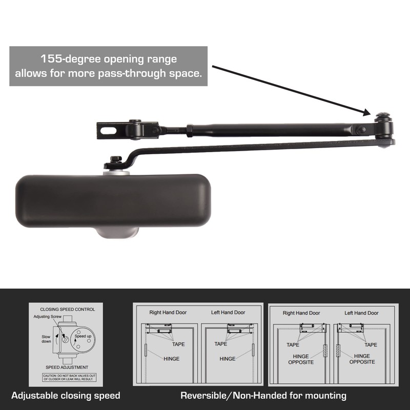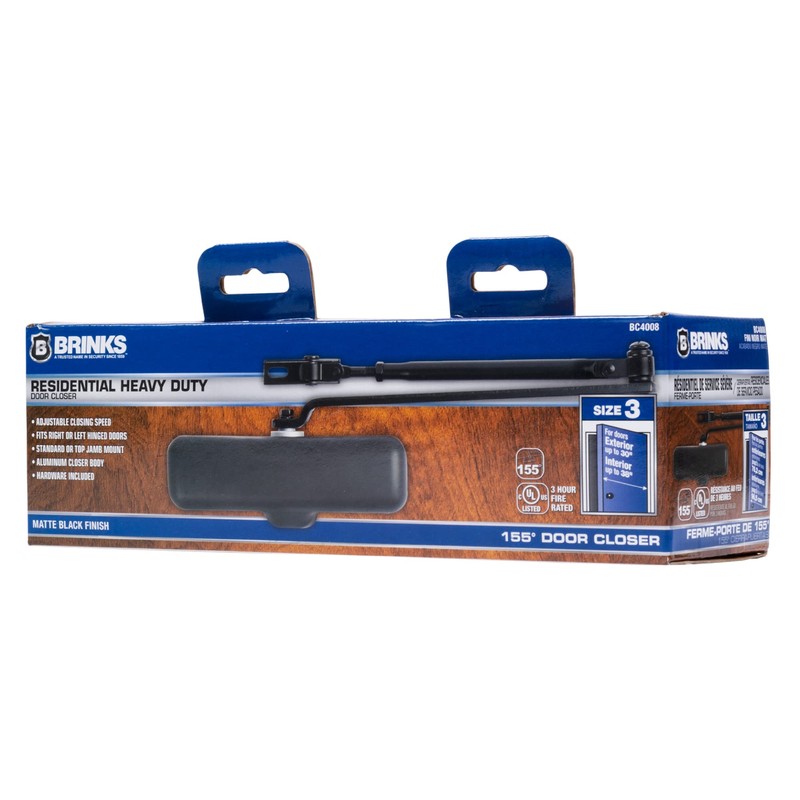 BRINKS Commercial - Heavy Duty Residential Door Closer, Matte Black Finish - Size 3 with a 155-Degree Opening Range and Adjustable Closing Speed