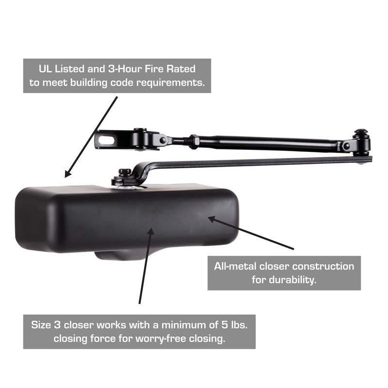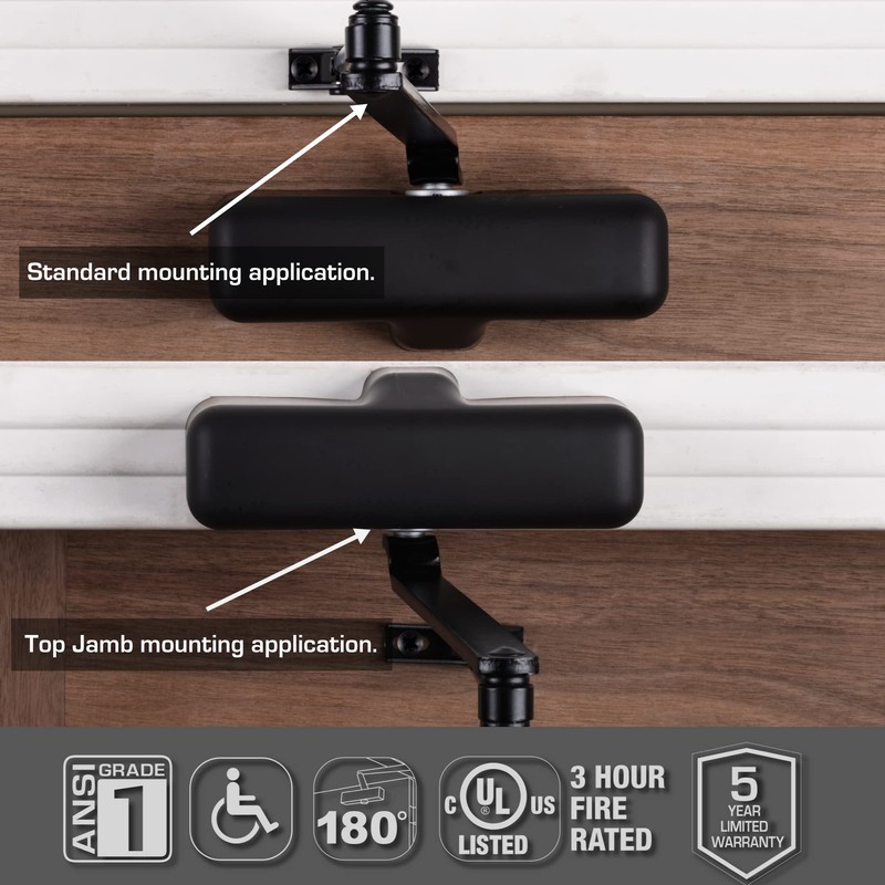- SPECIFICATIONS - Has a 3-hour UL fire rating. This closer fits on standard or top jam mounting applications with a 155-degree opening range.