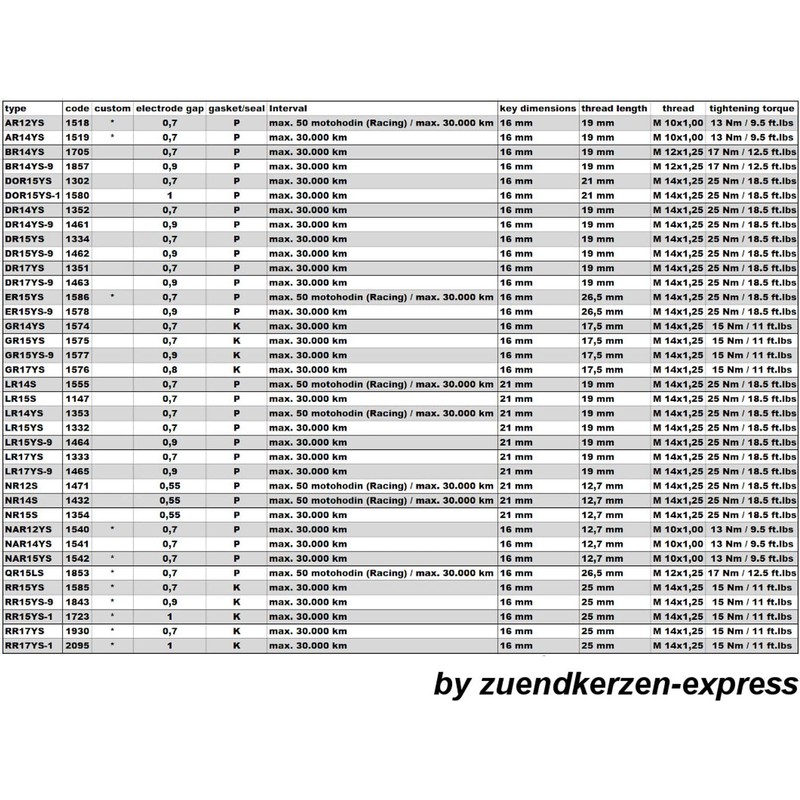Reference of this spark plug to other manufacturers (please note: For information only, check on the website of the respective manufacturer before installation):