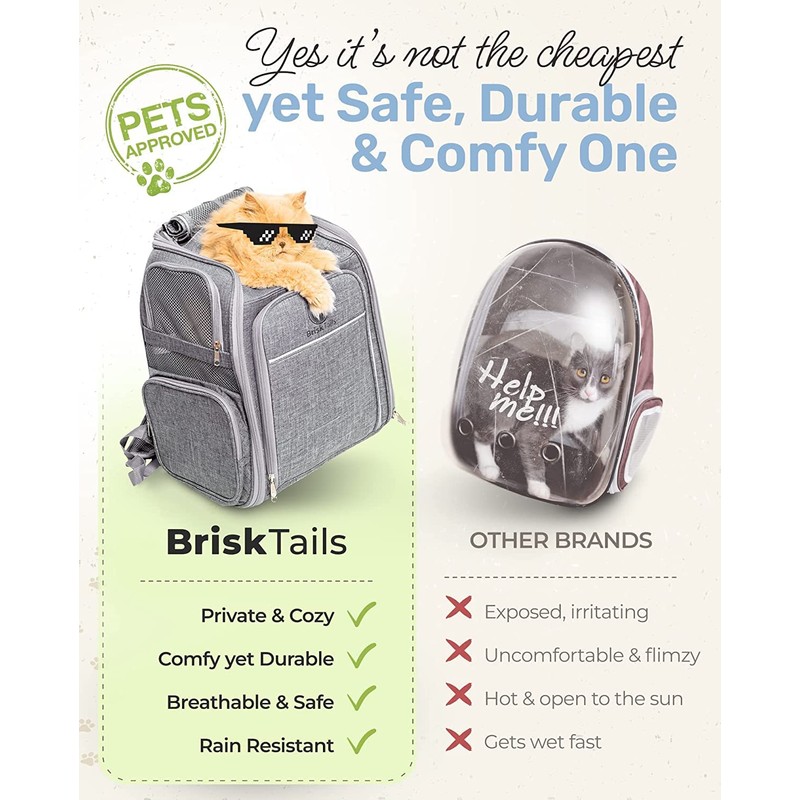 - UNLIKE OTHERS who claim to care about your pet's safety, at BriskTails, we really walk the talk. Our expandable cat carrier backpack is fortified with a foolproof "No-Chance-to-Escape" system, featuring a secure leash, self-locking zippers, and even a spot for attaching your car safety belt. Adventure with your furry friend with BriskTails, where their security isn't an option - it's a guarantee!