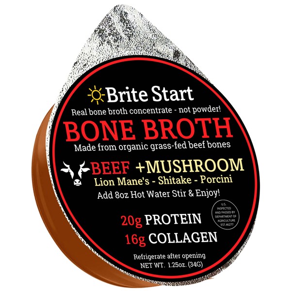 Brite Start Bone Broth - Beef + Mushrooms - Porcini, Shitake, Lion’s Mane - 12 Count - Keto Friendly Concentrate -16g Collagen 20g Protein -Made from Grass Fed Beef Bones- Single Serve Packets